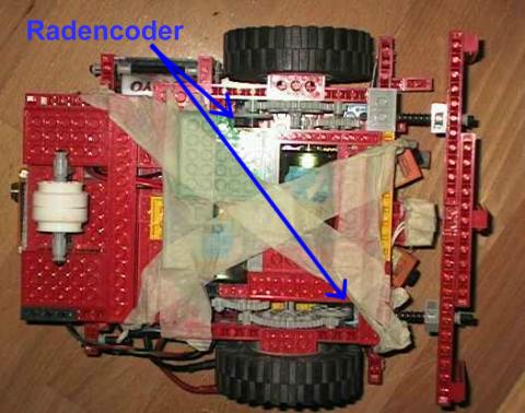 So ganz ausgereift war die Technik noch nicht die Motoren sind öfter mal raus gefallen und ziemlich laut war das Getriebe auch. Das starre Stützrad verbesserte das Gradeausfahren. Mit einem drehbaren Stützrad ist der Roboter immer in einem leichten Kreis gefahren. Die Radencoder bestehen aus Brückenlichtschranken einem Lochrad.